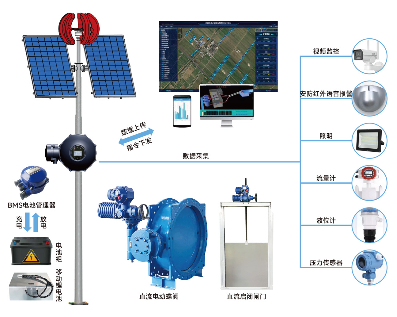 由太陽能光伏板和小型風力發(fā)電機為蓄能電池組充電,電池組有BMS電池管理軟件管控,為永磁無刷直流電機的各類驅動裝置供電,同時為視頻監(jiān)控,壓力、流量、液位傳感器,照明等供電